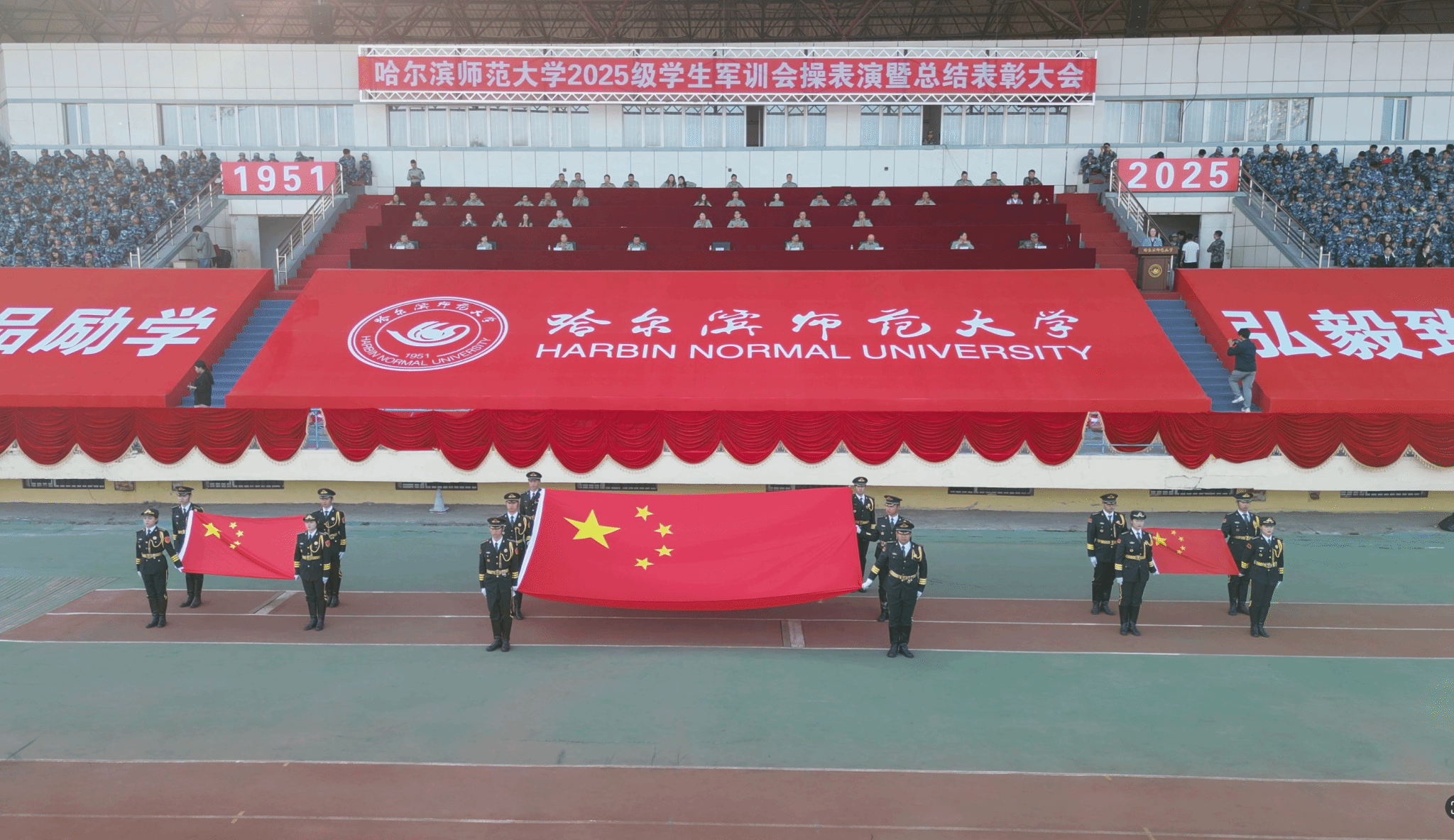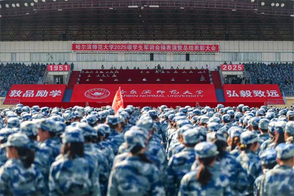 9月19日下午,哈尔滨师范大学2025级学生军训会操表演暨总结表彰大会现场,学校党委副书记、工会主席郭砾以“坚定政治信仰 肩负使命担当”为题,为新生讲授“国旗下的思政课”。